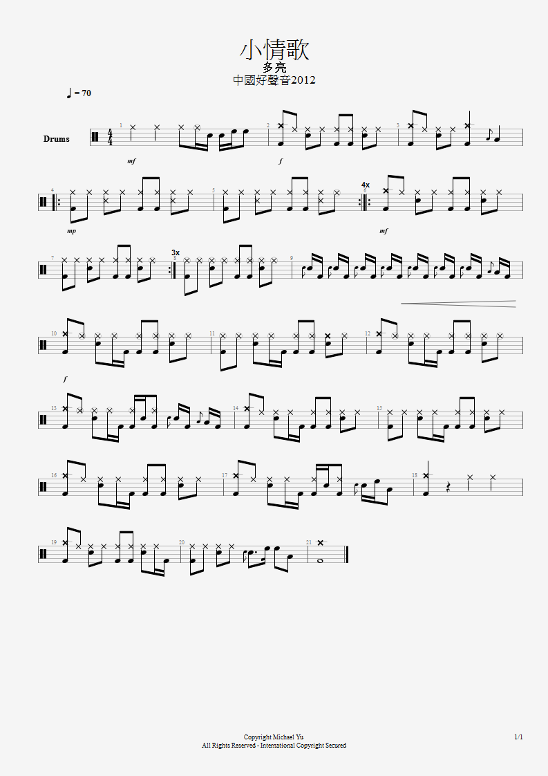多亮 小情歌 (中國好聲音2012) [鼓譜]